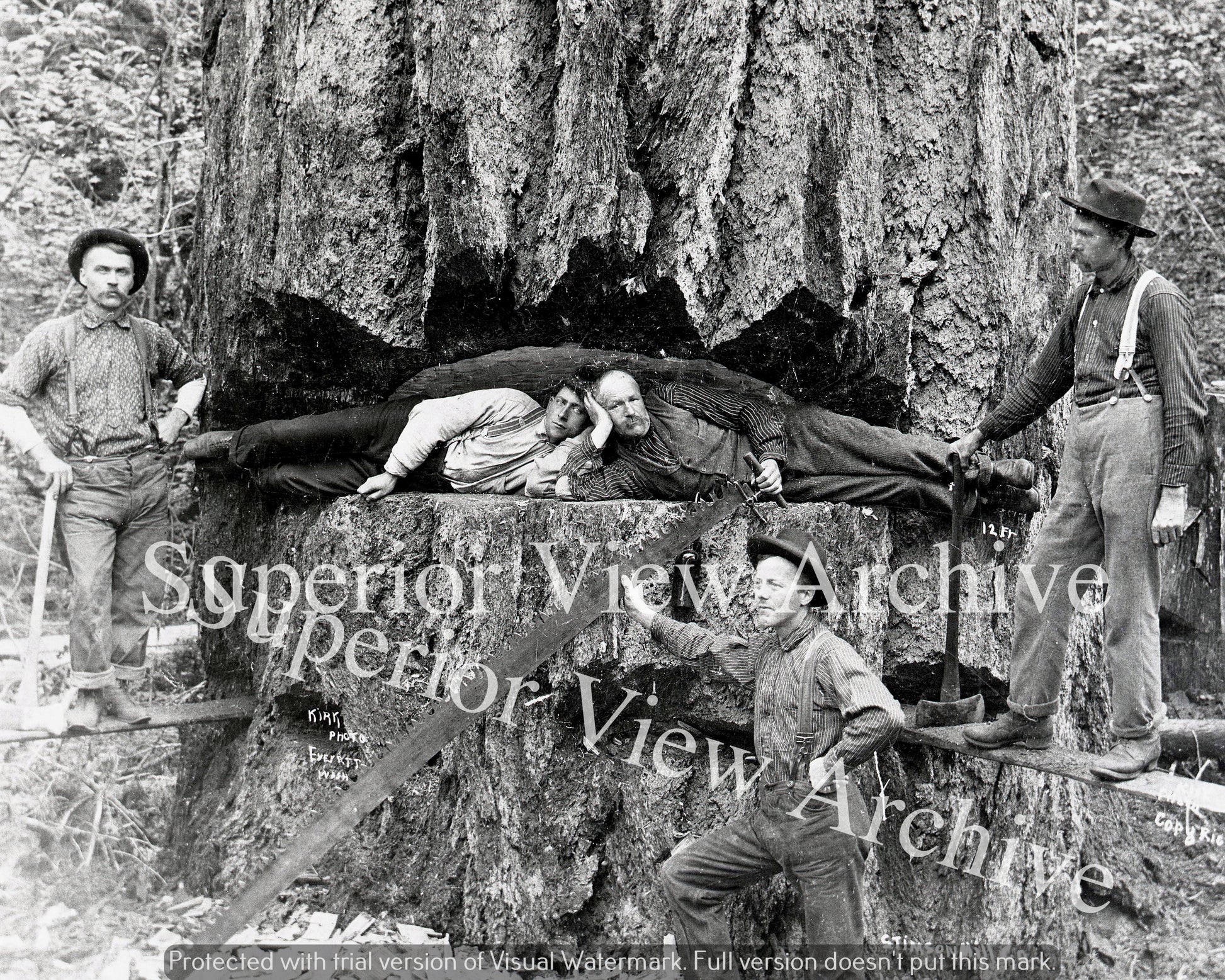Lumbering Douglas Fir Tree Lumberjacks Laying in Notch Crosscut Saw Everett WA